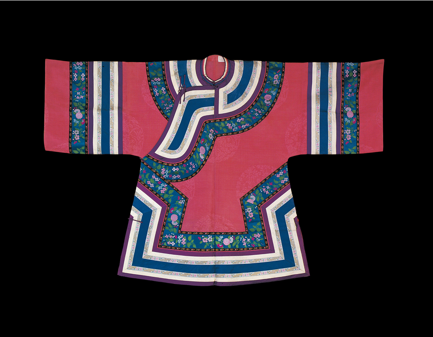 元代,作為民族大融合和中外文化大交流時期,長衣統(tǒng)稱為袍,其樣式南北方差異不大,但材料貴賤精粗,卻差距懸殊。漢族男性發(fā)式變化不多,但北方的漢族女性發(fā)式較前簡化。在元朝并沒有完整的冠服制度。蒙古人入主中原后仍保持其生活習(xí)俗,但同時又受漢族的影響,服飾日趨華麗。在大宴活動中,天子百官要穿統(tǒng)一顏色的服裝,稱為“質(zhì)孫服”,其形為袍襖狀,與漢族深衣相近(圖為漢族清代牡丹紋緞繡女裝,中央民族大學(xué)民族博物館館藏)。