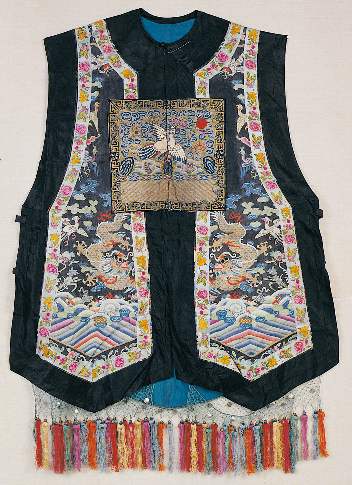 《史記·五帝本紀(jì)》載:“黃帝之前,未有衣裳屋宇。及黃帝造屋宇,制衣服,營殯葬,萬民故免存亡之難?!痹谖迩Ф嗄昵暗男率鲿r代仰韶文化時期,可能就產(chǎn)生了原始的農(nóng)業(yè)和紡織業(yè),開始用織成的麻布來做衣服。據(jù)傳,黃帝之妻嫘祖發(fā)明了飼蠶和絲紡,衣冠服飾基本成制。殷商西周,冠服制度逐漸完善,春秋戰(zhàn)國時期,衣冠款式走向多元,冠服制被納入“禮治”范疇,從此漢族衣冠服制更加詳備。中原地區(qū)還出現(xiàn)了胡服戎裝,甚至相沿成風(fēng)(圖為漢族清代七品文官女朝褂,中央民族大學(xué)民族博物館館藏)。