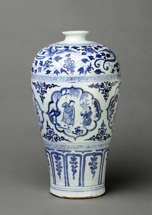 裝飾繁密是典型元青花的重要特點,它們由細巧的文化組成若干條帶環(huán)繞器身,裝飾帶數量通常很多,但惟獨沒有7層的,因為這個數字和蒙古族的喪葬與元代的刑罰有關。相反,9層裝飾帶的元青花卻為數不少,而這與蒙古族重九顯然有著直接的聯系【圖為元代后期青花四愛圖梅瓶。湖北省博物館藏】。