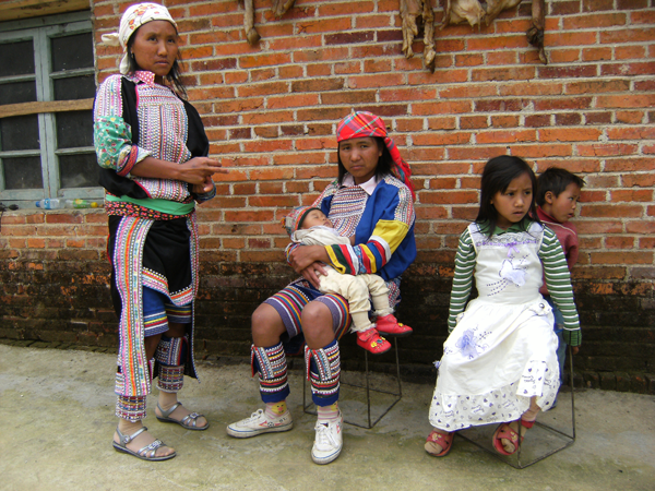 而婦女們的裝束特點(diǎn)分明與眾不同。最突出的是頭戴寬約3公分左右的銀箍,留長(zhǎng)發(fā);身著靛青色無(wú)領(lǐng)大襟右衽及橫條花筒裙。腰系紅布寬腰帶和數(shù)十根細(xì)藤圈。耳掛垂肩圓形大耳環(huán),頸戴銀質(zhì)大項(xiàng)圈,細(xì)項(xiàng)鏈。上了年紀(jì)的人,喜歡戴長(zhǎng)約五公分傘狀大耳筒,筒頂還刻有各種花紋。有的婦女在耳筒內(nèi)插上香花香草,有的放上人民幣,出門(mén)趕集,隨用隨取,很是便利(上下兩圖由劉軍供圖)。