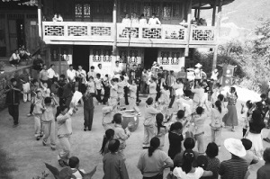 從古至今,每年的正月初九“舍巴節(jié)”(舍巴:土家語擺手舞的意思)、三月三“祭祖節(jié)”、“冬至會”,土家人都要在擺手堂舉行盛大的祭祀活動。農閑時的夜晚,在農家院壩,點燃熊熊篝火,男女老少在有奏的鑼鼓聲中歡快地舞蹈,盡情地歌唱。清代文人彭施鐸在《竹枝詞》中載:“福石城中錦作窩,土王宮前水生波,紅燈萬盞人千疊,一片纏綿擺手歌?!绷攘葦嫡Z把土家人跳擺手舞的盛況真實地展現出來。