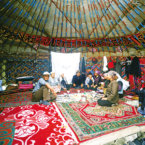氈房外觀通常樸實(shí)無(wú)華,門框由松木做成,上面雕刻花紋或繪制圖案,一塊鮮艷奪目的掛毯吊在門上。房?jī)?nèi)富麗堂皇,布置合理,前半部分堆放日用物品,后半部分待客、住人。