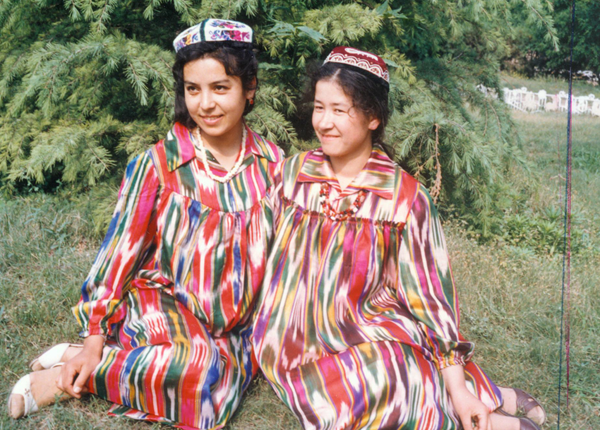 烏孜別克族女性喜愛(ài)穿連衣花裙,開(kāi)領(lǐng),寬大多褶,不束腰帶。上衣比較短,只及大腿部,無(wú)領(lǐng)、無(wú)袖、對(duì)襟,下擺的正中和正面兩邊都開(kāi)衩,形成兩片寬帶。襟和寬帶的邊都繡花。出門時(shí)還要穿斗篷、蒙面紗,從頭到腳都不能外露。