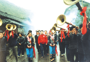 苗族姑娘們,穿鑲花邊衣褲,圍繡花抹裙,扎花絲頭巾,配銀飾花帶,可真叫艷麗。我們這些遠(yuǎn)道而來的游客受到熱烈的迎接,姑娘們用古樸的攔門對歌為我們洗塵。攔門地點是在村頭的小橋邊,姑娘們拉著一排民族織錦帶,滿面春風(fēng)地等待客人,兩邊苗鼓、獅子、嗩吶、甲馬長號夾道歡迎。儀式按苗族風(fēng)俗,由苗族姑娘們先唱熱情的迎客苗歌,再請客人唱歌作客,對歌三次方過攔門第一關(guān)。緊接著她們又捧出大碗苞谷酒向客人們一一敬酒。熱情好客的姑娘們一定要待客人喝了香醇的美酒后,才示攔門結(jié)束。然后,又一路鞭炮,一路號角吹吹打打,把我們請進苗寨。