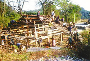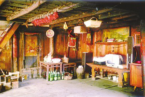 筆者看到的干欄式木樓和吊腳樓在使用的功能上相差無(wú)幾,上層住人待客,樓下四壁用木板圍擋,圈養(yǎng)畜禽,存放燒柴、農(nóng)具和秋收臨時(shí)堆放的糧食。豬圈靠里側(cè)依柱圍欄,其它空閑的地方打掃得干干凈凈,有的將織布機(jī)放在樓下明亮的地方。住房一般5間,兩頭兩間是偏廈,中間3間是寬敞的堂屋,一頭設(shè)火塘、土灶,為烤火、煮飯之處;另一頭的中柱供臨時(shí)設(shè)席敬神之用,也有的在板墻上設(shè)佛龕神位,供奉祖先;臥室依房柱用木板靈活隔間。大門(mén)有的開(kāi)在房山墻一側(cè),也有開(kāi)在中間的,皆登石階、板梯而上。吊腳樓一棟挨著一棟,小巷道曲折狹窄,只容牽牛和順向挑擔(dān)通過(guò)。