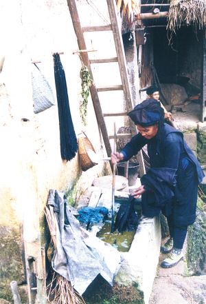 紡紗、織布、藍染,是哈尼族婦女制作服裝的重要組成部分。她們在織布前要做的準備工作,就是操動制線機,把一根根短小的線連接起來,捲在小木棍上,然后操動絞線機,把線棍上的線分開絞在木梭子和木輪子上。接著是分線,人數(shù)不限,但不能少于5人,一般10米為一組線??棽紩r,在織布機上方搭起兩排密集的線網(wǎng),當雙腳踩動踏板時,兩排線網(wǎng)一上一下地交叉移動,將拖著線的梭子一次次地左右穿梭于線網(wǎng)中。這樣重復地進行,就織出一筒筒布,一般10米為一筒布。最后把織成的布放入靛缸里泡洗,曬干后就可以制作服裝了。