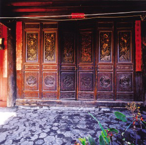 云南大理市綠桃村“三坊一照壁”民居堂屋六扇木門的雕刻。院內(nèi)廈廊和正房的格子門,一般由6扇組成,每扇門又分隔成5塊木板,每塊木板都是透雕和浮雕相結合的木雕。分別雕刻著“雙鳳朝陽、二龍搶寶、八仙過海、喜鵲登梅、漁樵耕讀、六合同春”的吉祥圖案,刀法嫻熟,輪廓清晰,形象生動,一個院落就是一個木雕藝術畫廊。此外,窗上有通透的花格,下部檻墻做成木質(zhì)裙板。