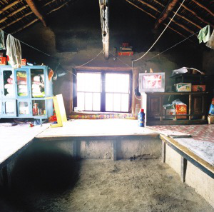 達斡爾族住房以兩間或三間居多,以西屋為上,不設北窗。東西兩屋的南面各有3扇窗戶,中間一間在房門兩側(cè)各有一扇窗戶,西屋開兩扇西窗,更利于采光和通風,這在北方民居中比較少見。兩間房的西屋是起居室,南、西、北三面連炕,成“凹”字形,與滿族的“萬字炕”差不多。近些年,達斡爾族家庭人口少了,特別是結婚的新房只搭北炕,南面放置組合家具和冰箱、洗衣機。東屋開南門,作為廚房,砌鍋灶,一般用8印或10印的鐵鍋。煙囪在墻外,與房頂有距離,有的用草垡子壘砌,有的用木板,這樣的煙囪不僅抽力大,灶堂好燒,而且可以避免草房頂?shù)幕馂?。近十幾年建的房子,煙囪都在西山墻上用磚壘砌,一直伸出屋脊后坡,高出房頂一米多。