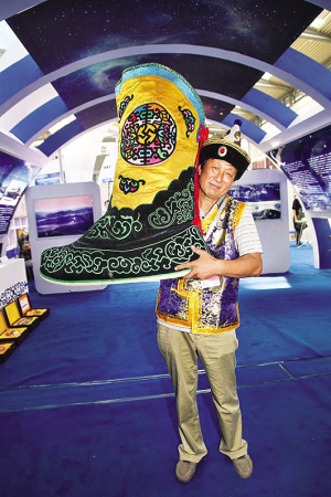 世界最大蒙古族繡靴亮相。靴長70厘米,高1米。 資料圖片