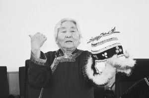 老人展示她制作的鄂倫春族傳統(tǒng)皮帽。