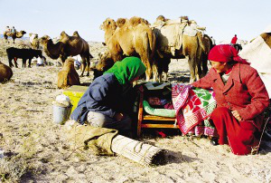 每戶人家的家就在那三四頭駱駝的背上,駱駝的先后排列也是有講究的。一般第一峰駱駝負(fù)責(zé)運(yùn)被褥,婦女和小孩也坐第一峰駱駝。后面的駱駝則運(yùn)衣服、日用品、食物、氈房的羊毛氈和氈房骨架。家里的男人們則騎著馬,趕著大群的牛羊緊跟在后面。平時(shí)來(lái)往較少的牧民們因?yàn)檗D(zhuǎn)場(chǎng),有了歡聚的機(jī)會(huì)。每天下午,牧民們就開始在路上安營(yíng)扎寨,男人們開始從駝背上卸下氈房,在路邊搭建臨時(shí)簡(jiǎn)易氈房;女人們生火煮飯,孩子們成群地奔跑嬉鬧,每家的牧羊狗或打架或形影不離。緩緩的炊煙在金色的黃昏中飄散,男人們開始圍在篝火旁喝酒唱歌,火光映紅每一張黝黑的臉龐,悠遠(yuǎn)的歌聲在空曠的夜空飄蕩。