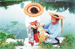 亮麗的頭巾,是用一兩百米長(zhǎng)的彩色花帶,一圈圈地往頭上悉心地盤纏,狀若葵花。頭巾隨著姑娘們俊美的身影晃動(dòng)在山野,宛若束束火樣的山花。盤頭巾的彩色花帶是靠姑娘們靈巧的雙手用紅黃兩色毛線編織而成。哪曾知道,盤個(gè)講究點(diǎn)的頭巾,除了從小就要不斷研習(xí),每天還得花上半個(gè)小時(shí)。耐看,但太過麻煩。近年來,瑤山的生活節(jié)奏也在加快,聰明的奉雪妹就別出心裁,幾經(jīng)實(shí)驗(yàn)改進(jìn),用竹篾條編成一個(gè)斗笠般的錐臺(tái)形骨架,再把花帶依次編滿骨架的上下兩面,就成了形似斗笠的花頭巾。出門往頭上一戴,與原有風(fēng)格相近,卻更顯風(fēng)韻,也更方便。這也是花瑤妹子對(duì)代代相承的傳統(tǒng)服飾文化的一次大膽改革。