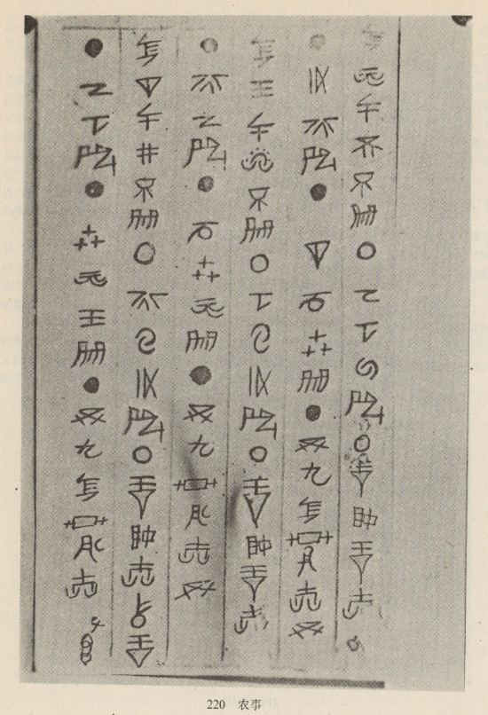 水書抄本。寫于清代,以竹簽作筆書于白皮紙上,共11頁。長(zhǎng)26厘米,寬18厘米,從右至左直排。此圖文字乃記述柙棚收獲的時(shí)節(jié),其第1行意為:庚午年丁巳日播種,吉。原件現(xiàn)存北京圖書館。