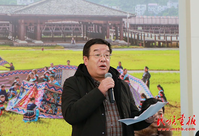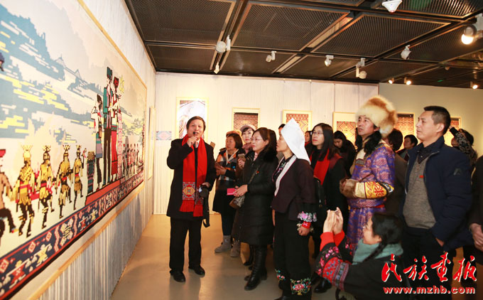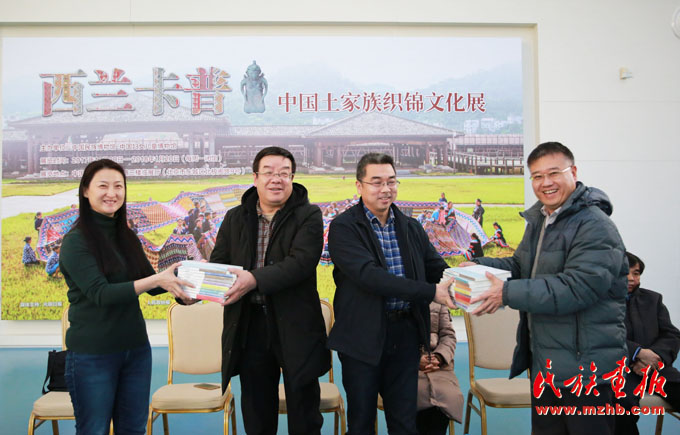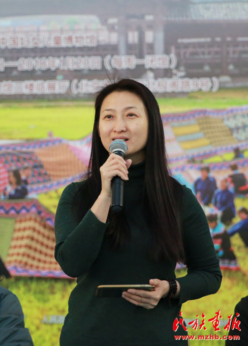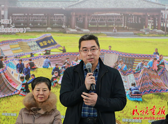 會上中國民族博物館黨委副書記、副館長張志文向少數(shù)民族作家們介紹了展覽,他說:“土家族是一個歷史悠久的民族,現(xiàn)在有835萬人口。土家織錦也有兩千多年的發(fā)展歷史,有250多種傳統(tǒng)圖案,是中國民間五大織錦之一,堪稱中國服飾文化中的奇葩。中國民族博物館從歷年征集收藏的300多幅清代以來的土家織錦中,選取了156幅精品土家織錦、21分鐘傳承人視頻和120余幅土家民族風(fēng)情照片。我們和中國婦女兒童博物館合作舉辦了這個高品質(zhì)的專題展,旨在傳承和弘揚土家族國家級非物質(zhì)文化遺產(chǎn)。”