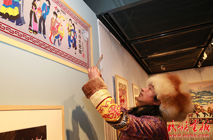 裕固族作家拿起手機拍攝《民族大團(tuán)結(jié)》織錦中的裕固族圖案
