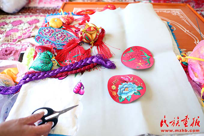 走進她的家中,只見不大的房間中擺滿了荷包、繡花鞋墊、枕頭等刺繡品。桌上五顏六色的彩線旁,馬阿英社和兒媳婦正聚精會神地依著設(shè)計好的圖案“飛針走線”。