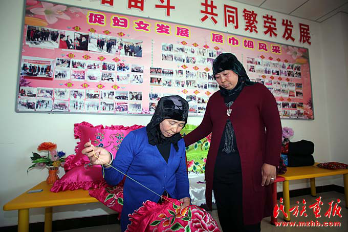 自精準(zhǔn)扶貧實施以來,東鄉(xiāng)縣婦聯(lián)依托“隴原巧手”等項目,在縣婦聯(lián)、坪莊鄉(xiāng)、布楞溝村、汪胡村等舉辦婦女刺繡培訓(xùn)班50余期,邀請專家指導(dǎo)教學(xué),并統(tǒng)一刺繡品樣式和質(zhì)量。把有基礎(chǔ)、感興趣的婦女發(fā)展成為培訓(xùn)骨干。馬阿英社的妹妹馬英英是骨干之一,她對記者說:“婦聯(lián)組織我們?nèi)ブ萆蠀⒓优嘤?xùn),用所學(xué)到的編織技術(shù)帶領(lǐng)貧困婦女發(fā)展,更好發(fā)揮‘傳幫帶’作用?!?/p>