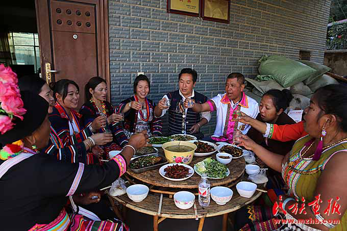 在曼夕村,民族傳統(tǒng)節(jié)日已成為不同民族間聯(lián)絡(luò)增進(jìn)感情的最佳時機(jī)。曼夕村村主任車達(dá)告訴記者,他自己是哈尼族,村里還有漢、布朗、哈尼等民族。40多年前,為了種植橡膠樹布朗族與彝族遷徙過來生活在一起,幾十年來,兩個民族相互尊重對方的生活習(xí)慣,過年過節(jié)相互走動拜訪,互相通婚成為一家人。晚飯時,記者在曼夕村村支書巖坎硝家里聚餐時看到車達(dá)帶著幾個哈尼族婦女盛裝出席,宴會上人們相互祝賀,唱敬酒歌。哈尼族婦女圖處告訴記者,哈尼族過傳統(tǒng)節(jié)日,布朗族村民要來慶賀,布朗族過節(jié),哈尼族人也去祝福,幾十年來一直如此。