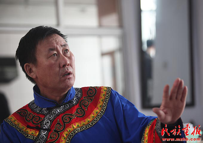 國家級非物質文化遺產項目赫哲族“伊瑪堪”代表性傳承人吳寶臣演唱“伊瑪堪”(袁東平 攝影)
