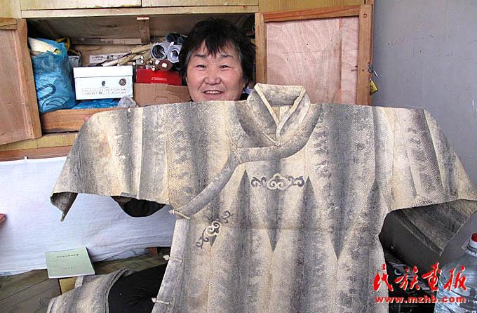 魚皮服飾是赫哲族魚皮文化的重要組成部分,其制作工藝十分精巧,是赫哲族獨有的民族服裝(袁東平 攝影)