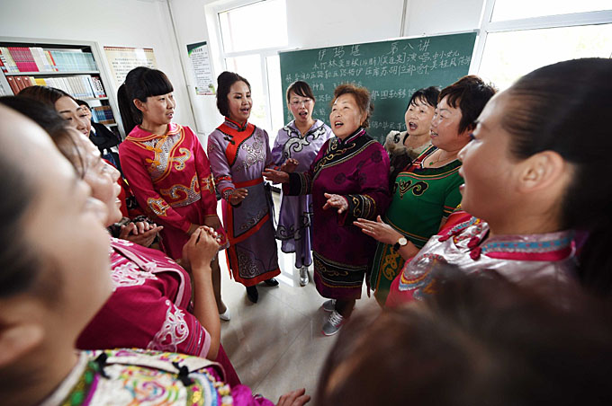 “伊瑪堪”傳承人吳桂鳳(右四)在同江市八岔赫哲族“伊瑪堪”傳習所教授“伊瑪堪”(新華社記者王建威 攝影)