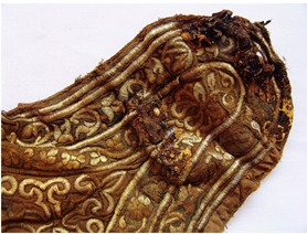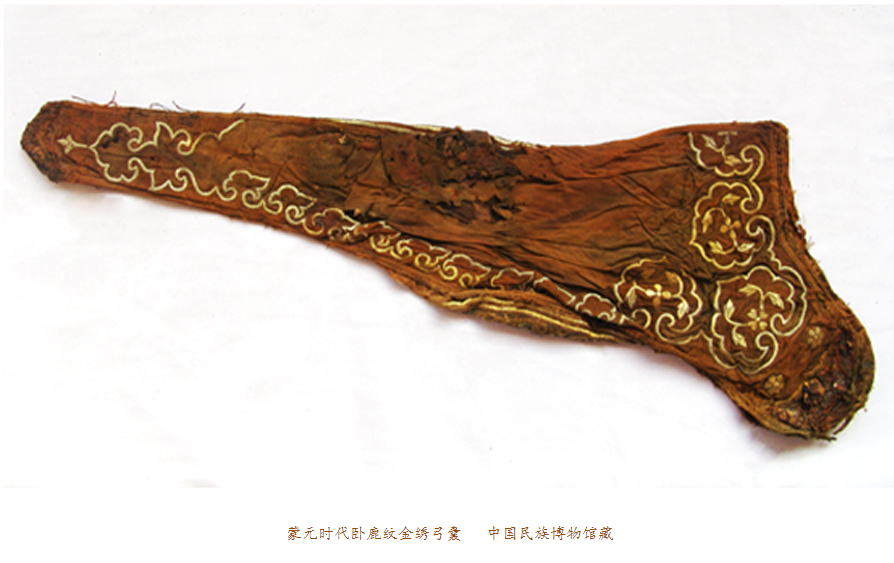我們?cè)?jīng)描述過(guò)元代納石失生產(chǎn)的空前絕后。蒙古民族把對(duì)于黃金的寶愛(ài),傾泄進(jìn)元朝一百年的歷史時(shí)空。在整個(gè)13世紀(jì)的每一個(gè)歷史篇章,都鐫刻著納石失的金縷光影。我們?cè)谑妨侠锟吹?,天子之衣是納石失,天子之裳是納石失,天子之履依然是納石失。那么,蒙元一代,還有什么是用黃金絲線耗盡心血織繡而成的呢?現(xiàn)在,我們看到了這只金繡弓囊。