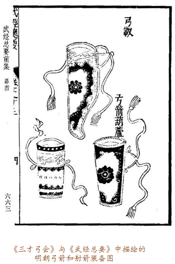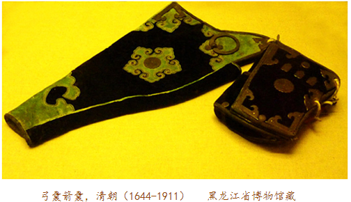 當(dāng)弓囊出現(xiàn)在眼前時(shí),我們應(yīng)當(dāng)想到它的另一半——箭囊。實(shí)事上,古代盛裝弓箭的器物被稱(chēng)為櫜鞬(gāo jiàn),櫜盛箭,鞬裝弓,多以皮革制作。比如明十三陵出土的萬(wàn)歷皇帝陪葬品櫜鞬,就用皮革縫制,外敷黃色素緞,金繡龍紋,鑲嵌金飾件及各色寶石。一般來(lái)說(shuō),弓囊為上寬下窄的袋形,箭囊則為長(zhǎng)方形。在蒙古語(yǔ)中,弓囊與箭囊合稱(chēng)為“撒答”。因?yàn)椤按稹迸c“袋”讀音相近,所以元代的漢族作家便在作品中將之寫(xiě)為“撒袋”。這樣,“撒袋”一詞便入了漢語(yǔ)詞匯,特指裝弓盛箭的袋子。