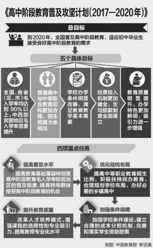 據(jù)中國(guó)民族報(bào)訊 2017年4月6日,教育部公布《高中階段教育普及攻堅(jiān)計(jì)劃(2017-2020年)》(以下簡(jiǎn)稱(chēng)《攻堅(jiān)計(jì)劃》)。《攻堅(jiān)計(jì)劃》提出,到2020年,全國(guó)普及高中階段教育。我國(guó)高中階段教育毛入學(xué)率將要達(dá)到90%。