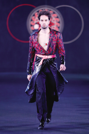課題組將彝族銀飾經典的浮雕圖案元素、彝族畢摩繪畫和文字元素、彝族服飾傳統(tǒng)紋樣圖案元素、彝族鸚嘴帽元素、朵洛荷舞蹈元素、察爾瓦流蘇元素等融入到作品中,沿用傳統(tǒng)民族服裝的色調,并對圖案和造型進行現(xiàn)代設計和審美的轉化與提升,傳統(tǒng)服飾與現(xiàn)代創(chuàng)新設計相結合,碰撞出了新的時尚美感。