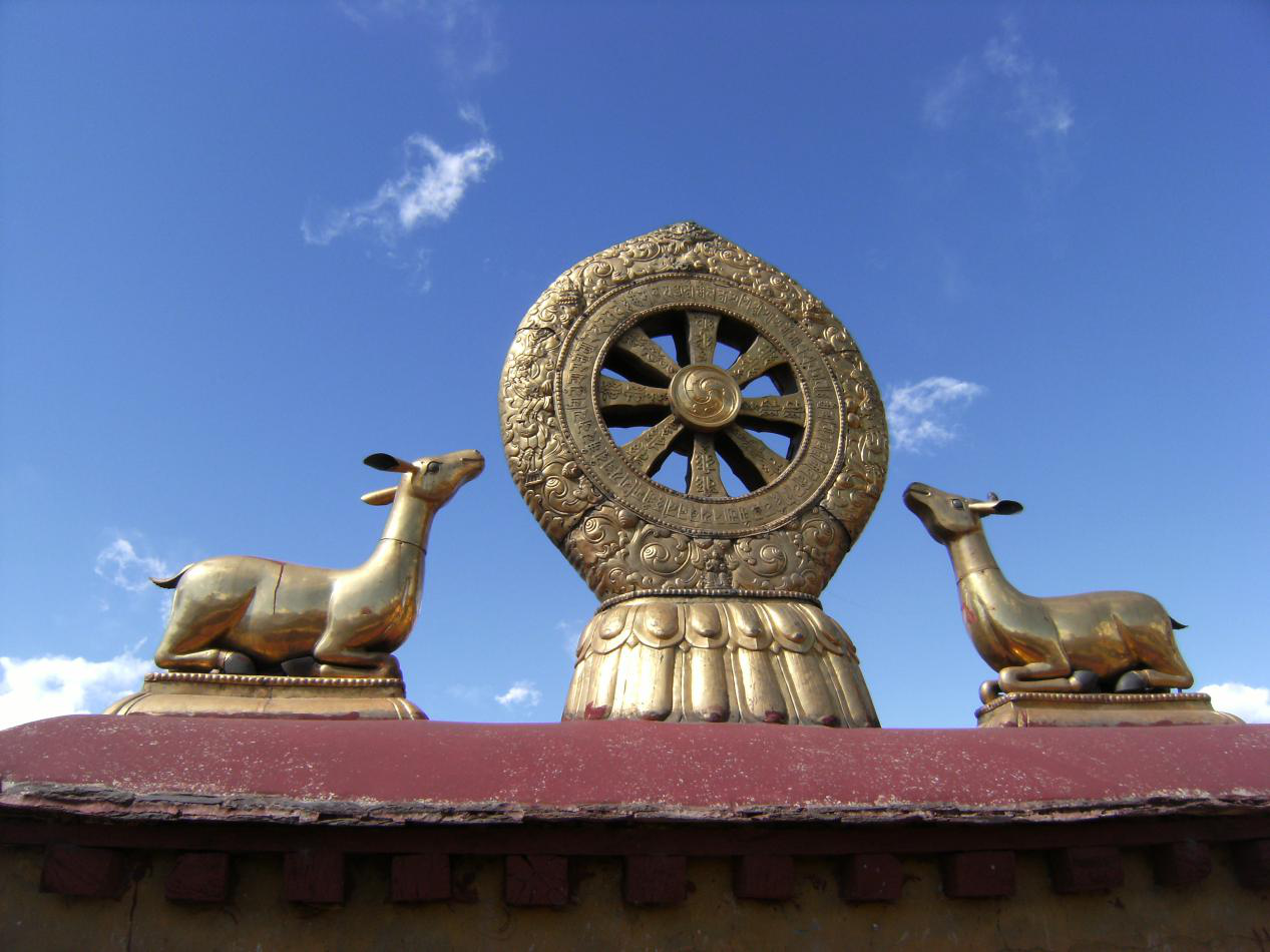 全寺坐東朝西,建筑具唐代風格,有高四層的銅質(zhì)鎦金樓閣五座、殿堂數(shù)十間。正殿供奉文成公主從長安帶往的釋迦牟尼像,像前擺放十二盞金燈。各殿有松贊干布、文成公主、墀尊公主的塑像及佛像、祖師塑像,還有壁畫眾多。珍藏有七世紀以來的歷代文物。
