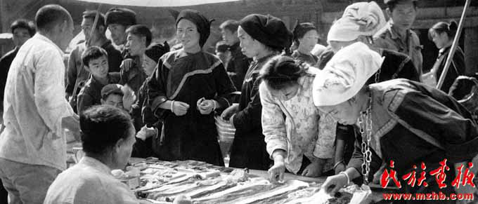 1980年,全國(guó)民族地區(qū)落實(shí)黨的民族政策,切實(shí)尊重少數(shù)民族的傳統(tǒng)習(xí)慣,轟轟烈烈地恢復(fù)民族傳統(tǒng)集市,以最短的時(shí)間恢復(fù)生產(chǎn)、發(fā)展自由貿(mào)易、豐富群眾生活。圖為貴州苗族農(nóng)村市場(chǎng)開(kāi)始活躍起來(lái)《民族畫(huà)報(bào)》1982年第1期