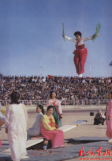 1982年9月2日至8日,第二屆全國(guó)少數(shù)民族傳統(tǒng)體育運(yùn)動(dòng)會(huì)在內(nèi)蒙古呼和浩特舉行,圖為朝鮮族婦女展示傳統(tǒng)游戲項(xiàng)目——跳板。全國(guó)少數(shù)民族傳統(tǒng)體育運(yùn)動(dòng)會(huì)發(fā)掘了一大批新項(xiàng)目,并在探索普及與提高結(jié)合、群眾性與專業(yè)化結(jié)合、傳統(tǒng)體育與現(xiàn)代體育結(jié)合、民族性與世界性結(jié)合的道路上取得了可喜的進(jìn)步,使少數(shù)民族傳統(tǒng)體育走上了普及、提高、規(guī)范、科學(xué)的道路。目前全國(guó)少數(shù)民族傳統(tǒng)體育運(yùn)動(dòng)會(huì)已經(jīng)舉辦了十屆《民族畫(huà)報(bào)》1982年第12期