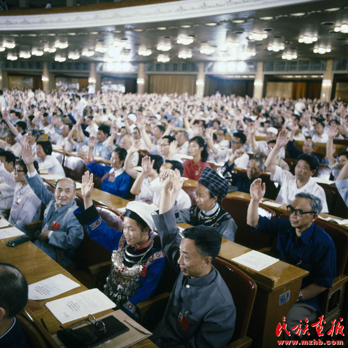 1984年5月31日,中華人民共和國(guó)第六屆全國(guó)人民代表大會(huì)第二次會(huì)議通過(guò)了《中華人民共和國(guó)民族區(qū)域自治法》,自1984年10月1日起施行。民族區(qū)域自治制度是我國(guó)的一項(xiàng)基本政治制度。圖為各族代表舉手表決通過(guò)《中華人民共和國(guó)民族區(qū)域自治法》《民族畫(huà)報(bào)》2009年慶祝中華人民共和國(guó)成立60周年???/p>