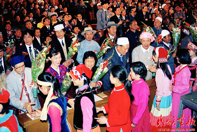 1988年4月25日至29日,首次全國(guó)民族團(tuán)結(jié)進(jìn)步表彰大會(huì)在北京舉行,圖為大會(huì)現(xiàn)場(chǎng).《民族畫(huà)報(bào)》1988年第8期