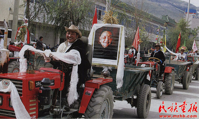 2004年8月21日,西藏山南地區(qū)乃東縣的農(nóng)牧民高懸鄧小平畫(huà)像,開(kāi)著拖拉機(jī)在山南街頭巡游,表達(dá)對(duì)改革開(kāi)放總設(shè)計(jì)師鄧小平同志的深切緬懷。改革開(kāi)放后,西藏自治區(qū)農(nóng)牧民的年人均收入已從改革開(kāi)放初期的幾百元上升至2004年的2000元左右,西藏城鎮(zhèn)居民年收入則超過(guò)7000元,位居西部前列?!睹褡瀹?huà)報(bào)》2008年第12期