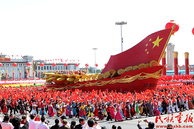 新中國(guó)成立以來(lái),黨和國(guó)家始終堅(jiān)持把馬克思主義民族理論同中國(guó)民族問(wèn)題具體實(shí)際相結(jié)合,始終堅(jiān)持把民族工作作為一項(xiàng)重大工作來(lái)抓,團(tuán)結(jié)帶領(lǐng)全國(guó)各族人民共同團(tuán)結(jié)奮斗,共同繁榮發(fā)展,開(kāi)創(chuàng)了中國(guó)特色解決民族問(wèn)題的正確道路,取得了舉世矚目的成就,積累了彌足珍貴的成功經(jīng)驗(yàn)。2009年10月1日,在北京天安門廣場(chǎng),20萬(wàn)軍民以盛大的閱兵儀式和群眾游行歡慶新中國(guó)60華誕,圖為各民族學(xué)生參加“團(tuán)結(jié)奮進(jìn)”方陣群眾游行。《民族畫(huà)報(bào)》2009年第10期