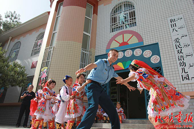 民族團(tuán)結(jié)是國(guó)家統(tǒng)一、繁榮昌盛的前提和保證,各民族“共同團(tuán)結(jié)奮斗,共同繁榮發(fā)展”是我國(guó)民族工作的主題。全國(guó)各地扎實(shí)開(kāi)展民族團(tuán)結(jié)進(jìn)步創(chuàng)建工作,平等團(tuán)結(jié)互助和諧的社會(huì)主義民族關(guān)系進(jìn)一步鞏固和發(fā)展。2011年,空軍駐新疆和田某指揮所首次投資80萬(wàn)元,開(kāi)辦了和田八一愛(ài)民雙語(yǔ)幼兒園,讓30個(gè)家庭的孩子進(jìn)入雙語(yǔ)班成為首批“藍(lán)天春蕾兒童”。圖為維吾爾族戰(zhàn)士艾力夏提和該園兒童一起玩老鷹捉小雞游戲?!睹褡瀹?huà)報(bào)》2011年第11期