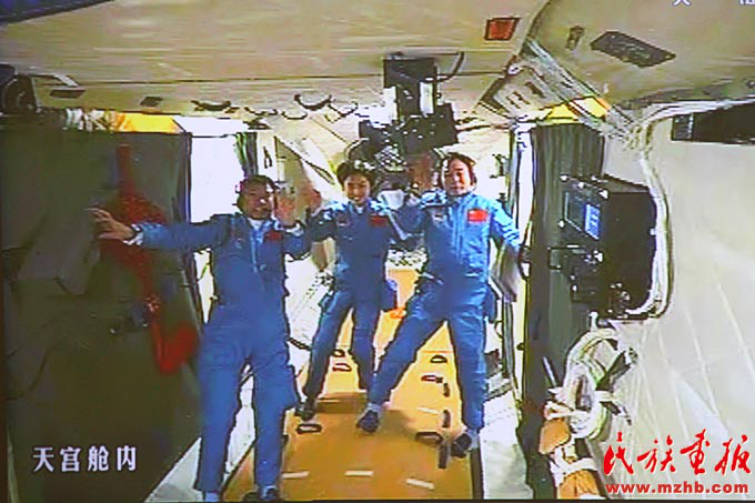 2012年6月18日,神舟九號(hào)飛船與天宮一號(hào)完成自動(dòng)交會(huì)對(duì)接,兩飛行器形成穩(wěn)定運(yùn)行的組合體后,三位航天員先后進(jìn)入天宮一號(hào)目標(biāo)飛行器,這實(shí)現(xiàn)了中國(guó)載人航天歷史上首次對(duì)一個(gè)在軌運(yùn)行的航天器的拜訪和駐留。圖為在北京航天飛控中心大屏幕拍攝到的航天員景海鵬、劉旺、劉洋在天宮一號(hào)實(shí)驗(yàn)艙內(nèi)的畫(huà)面?!睹褡瀹?huà)報(bào)》2012年第7期