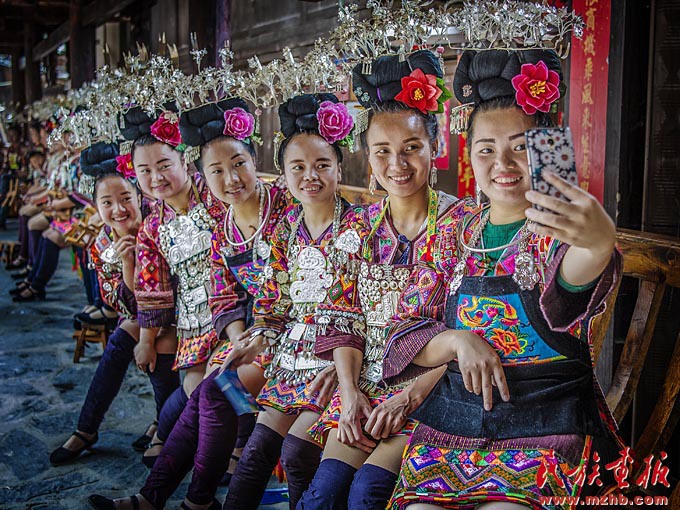 經(jīng)歷改革開(kāi)放40年的發(fā)展,我國(guó)社會(huì)生產(chǎn)力、綜合國(guó)力、人民生活水平實(shí)現(xiàn)了歷史性跨越,全黨全國(guó)各族人民要更加緊密地團(tuán)結(jié)在以習(xí)近平同志為核心的黨中央周圍,高舉中國(guó)特色社會(huì)主義偉大旗幟,不忘初心,牢記使命,將改革開(kāi)放進(jìn)行到底,不斷實(shí)現(xiàn)人民對(duì)美好生活的向往,在新時(shí)代創(chuàng)造中華民族新的更大奇跡。圖為貴州民眾盛裝自拍?!睹褡瀹?huà)報(bào)》2018年第3期