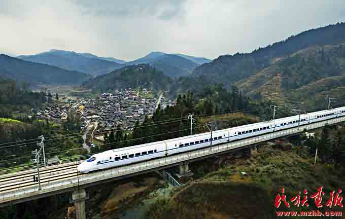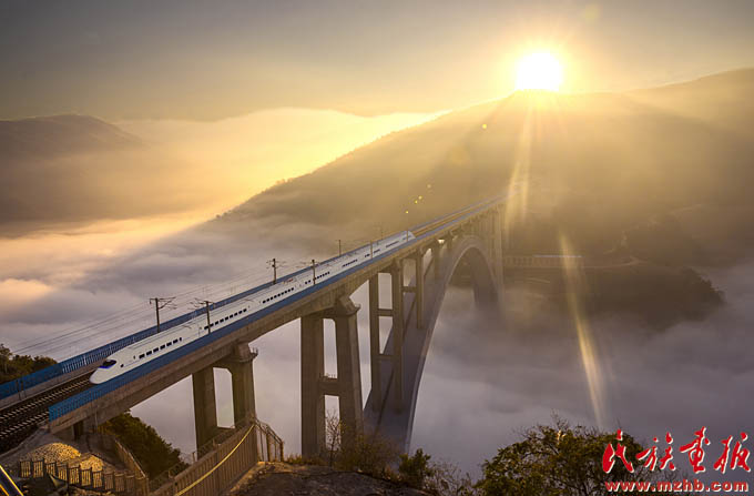 改革開放40年來,少數(shù)民族和民族地區(qū)成為改革開放的切實受益者,2017年1月1日,滬昆高鐵線上的列車沐浴著新年的陽光飛馳在云貴高原上(史家明 攝影)