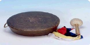 與小鑼相似但比小鑼要大,通常為面徑70CM,邊圈高10CM,邊穿小孔,用繩索固定。演奏時,左手提繩,右手拿錘演奏;盤坐演奏時大鑼懸掛在木架上,可以用手來控制音色,其聲音洪亮、粗獷。