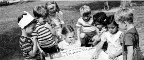 1950年,聯(lián)合國國際育童學校的孩子們在閱讀第一張《世界人權宣言》的海報。