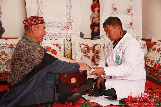居馬泰·俄白克多年的恩師阿吾爾達(dá)·合德爾現(xiàn)在也是他的病人,這位80多歲的老人向記者說道居馬泰·俄白克翻雪山、過冰河,無數(shù)次遇險(xiǎn),但他仍在堅(jiān)持。把我們這些患者當(dāng)作家人對(duì)待。學(xué)生時(shí)代的居馬泰·俄白克就是思想積極,熱心善良的好孩子。工作后獲得榮譽(yù)受到習(xí)總書記的接見,回到工作崗位上,很多牧民騎馬趕來看望他,他就利用這個(gè)機(jī)會(huì)向牧民宣傳黨的惠民政策、民族團(tuán)結(jié)和健康保健等知識(shí)?!?/p>