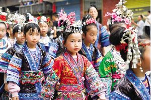 侗族小姑娘參加盛裝巡游。