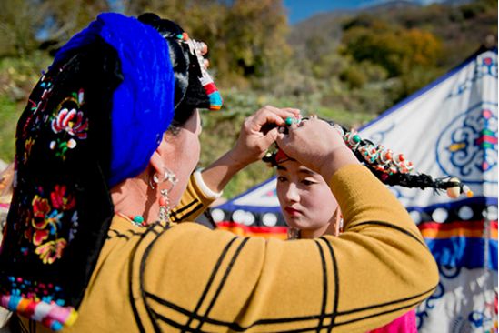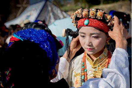 盤好發(fā)髻,佩戴好頭飾,在肩、背系好五彩哈達(dá)后,由本村具有威望的女性長者引領(lǐng)來到儀式現(xiàn)場。法號(hào)聲中,煨桑的青煙裊裊升起,威嚴(yán)的活佛主持誦經(jīng)祈福儀式。隨后,德高望重的長者為參加儀式的女子送祝福茶,長輩為姑娘們獻(xiàn)哈達(dá)。一系列儀式結(jié)束后,無論男女老少,都來到場地中央,踏歌起舞,跳起吉祥的鍋莊。