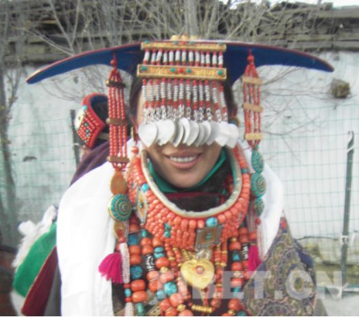 第二種在常規(guī)穿戴時是作為項圈的。金、銀質(zhì)材共同構(gòu)成的方形裝飾物是項圈的主要構(gòu)成要素,一般外圍為銀,中間部分為金,在外圍銀質(zhì)部分的四角以及金質(zhì)部分的中間各鑲嵌一塊綠松石。一個項圈上共有三塊此類方形裝飾物,從中間向兩邊,分布協(xié)調(diào)。其他部分以珊瑚珠鑲嵌,并以綠松石為點綴。珊瑚珠的排列密度與珠體大小有關(guān),一般以7—9行者居多。項圈看上去色澤艷麗且顯高貴。那么,項圈怎么又會成為頭飾的呢?原來,在某些特殊場合,尤其是非正式場合下,人們有時便會把項飾取下,“換一種感覺”,把它作為一種休閑“帽子”固定于額頭上。這也體現(xiàn)了普蘭人民在服飾文化方面的創(chuàng)造性。