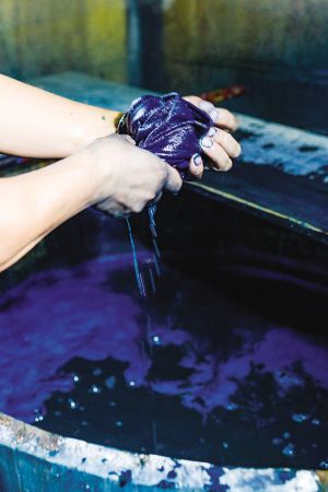 制作女子盛裝服飾是最復(fù)雜的,黎鳳珍需要先將粘膏在白布上畫出裙邊圖案和背心圖案。染布時,她要上山割蕨草,再摻雜一些不知名的草,燒成灰,隨后過濾,用過濾后的水與適當(dāng)比例的藍(lán)靛和酒混合,攪拌均勻,最后制成染布的水??椇玫陌撞迹仙酵谝环N植物的果實(shí)——“多亞”果,進(jìn)行浸染,一般在每年的七八月進(jìn)行。洗凈挖來的“多亞”果切成片煮沸后,把布放入湯中浸泡,撈出后在烈日下曬干,這一環(huán)節(jié)需要不斷地重復(fù)進(jìn)行。