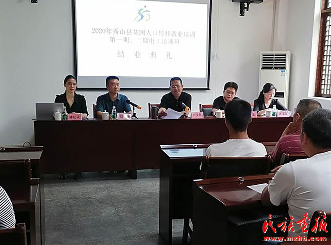 2020年6月29日,鐘億靈(左一)出席在清溪場(chǎng)鎮(zhèn)武陵山致富帶頭人實(shí)訓(xùn)基地舉行的秀山縣2020年貧困人口轉(zhuǎn)移就業(yè)培訓(xùn)第一、二期電工培訓(xùn)班結(jié)業(yè)典禮。(秀山縣人民政府網(wǎng))