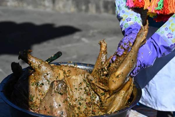 腌漬的時(shí)間越長,調(diào)料越能入味,揉好鹵汁,還要腌制個(gè)把小時(shí)。房屋后面,也是一派繁忙的景象,挖土坑,摔膠泥,大家都在為這一道隆重的美食做著準(zhǔn)備工作。全羊用野芭蕉葉、草果葉或大粽葉、大竹葉捆裹停當(dāng),用膠泥裹糊嚴(yán)實(shí),挖一土坑,先放入一堆柴火燒起,把土坑徹底燒熱,再把土包羊放到土坑里,土包羊上下左右堆放滿柴火開始燒烤,約2小時(shí)后,木柴全部化為灰燼,然后刨土覆蓋嚴(yán)嚴(yán)實(shí)實(shí),不能透氣絲毫。