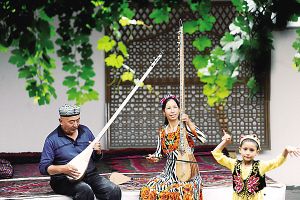 走進(jìn)艾依提·依明家,更像是走進(jìn)了一座民族樂(lè)器展覽館。記者看到,庭院中央鋪著紅色的地毯,4名自治區(qū)級(jí)非遺傳承人一字兒排開(kāi),正演奏著維吾爾族傳統(tǒng)音樂(lè)十二木卡姆的篇章,前來(lái)參觀的游客們也紛紛參與到歌舞表演之中。彈奏結(jié)束后,傳承人之一的買(mǎi)買(mǎi)提·鐵木爾熱情地向觀眾展示手中精致的都塔爾,自豪地分享著自己摸索出來(lái)的一套制琴和調(diào)音的秘訣。